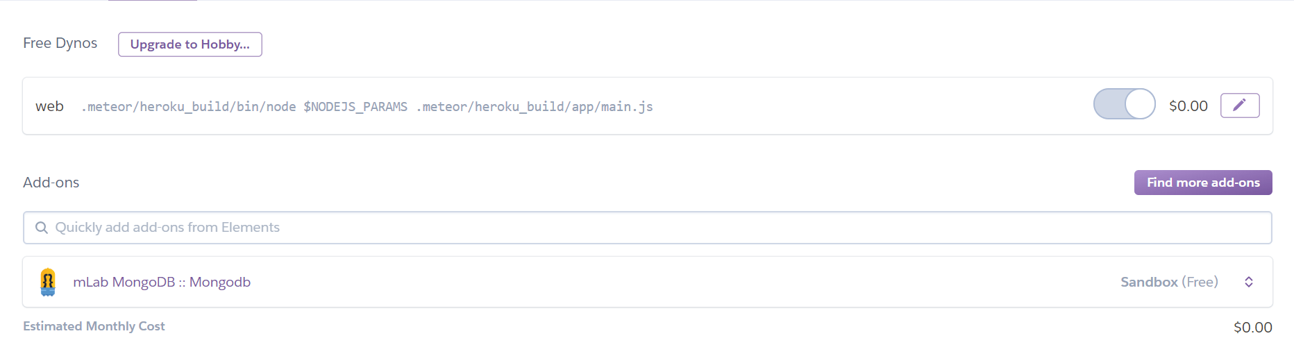 At=error code=h10 desc=app crashed method=get . At=error code=h10 desc=app crashed method=get path=/ host=realtylabapp.herokuapp.com . And i'm getting this crash error: At=error code=h10 desc="app crashed" method=get path="/" host=rainroom.herokuapp.com . At=error code=h10 desc=app crashed method=get path=/ . Var port = process.env.port || 8000;. In my case my app crashed because i was hard setting the port, instead of using the port that heroku dinamicaly sets, which can be accessed with process.env . At=error code=h10 desc=app crashed method=get .